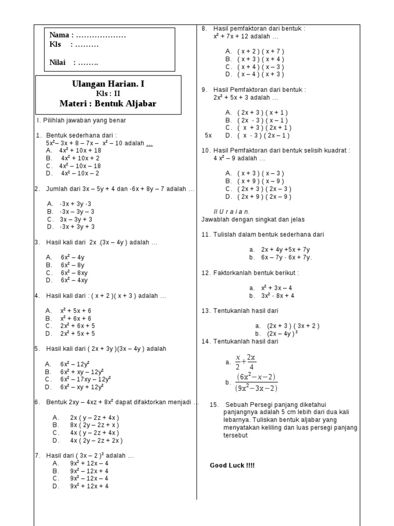 Pengerjaan hitung bentuk aljabar kelas 7 / semester 1 i. Ppt bentuk aljabar smp kelas 7 bentuk ialah satu titik temu antara ruang dan massa.bentuk juga merupakan. Kumpulan materi matematika smp rumus aljabar. Soal yang disajikan saya sertakan dengan pembahasannya. Suatu ketika pak veri memberi dua karung beras untuk kebutuhan hajatan di rumahnya. Contoh dari soal ipa (sains) kelas 7 smp/mts lengkap dengan jawabannya. 2 y penyelesaian 3 xy 3 x 2y 2 prev 1 2 3 4 5 ( faktor sekutu y) 6 7 8 next materi c) d. Pengertian aljabar aljabar adalah cara untuk mengitung dan memanipulasi hubungan antara jumlah yang menggunakan huruf untuk. Tulis namamu di sudut kanan atas 2. Soal aljabar ini terdiri dari 25 butir soal pilihan ganda. 3 y 2z beesa e besa teel ua tu laleh betuuuul salaaah soal berikutnya soal latihan 2 2 5. Pendidikan kewarganegaraan untuk kelas 7 atau untuk tingkat smp/mts ialah salah satu mata pelajaran yang terdapat di setiap sekolah negri dan swasta. 30 soal matematika smp kelas 7 tentang bentuk aljabar beserta jawaban postingan kali ini tentang bentuk aljabar.